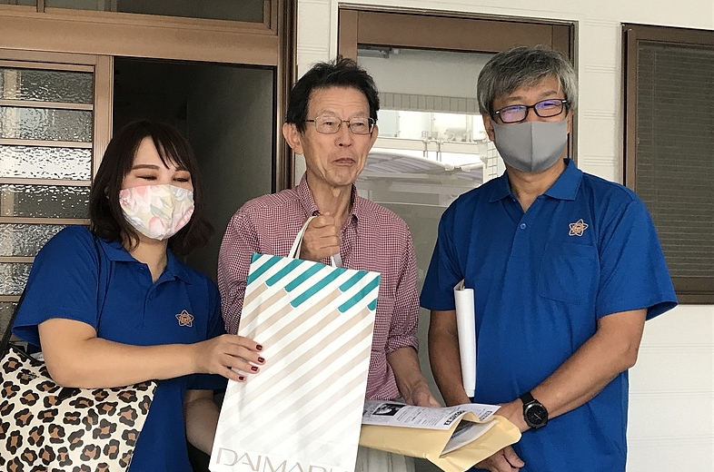 各家庭には民団京都本部の広報誌「民団タイムス」、デイケアのチラシと左京支部の「支部便り」、文化教室のフライヤーなどの広報物をはじめ、「コロナに負けるな!みんなで頑張ろう!」と書かれたチラシを袋に入れたマスク、消毒ジェルのほか、民団オリジナルのエコバッグ、なども配布した。