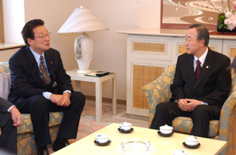 今年1月に外交通商部長官に就任した潘長官は、米国訪問の帰途、7日に来日し、同日夕に川口順子外相と会談。翌8日の午前中に自民党・安倍晋三、公明党・冬柴鉄三の与党両幹事長と国会内で会談し、同日夕には小泉純一郎首相と首相官邸で会談した。このような忙しいスケジュールの中で民団中央3機関長らと懇談した。