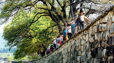 全羅南道順天市楽安面にある楽安邑城も新緑が芽吹き、小学生が城郭の上を歩きながら散歩を楽しんでいる。1397年(太祖6年)に築城された楽安邑城は、現存する朝鮮時代の城の中で最も完全に保存された石築邑城。城内には実際に生活している108戸と朝鮮時代の客舎、市場、草家などが原型通り保存されており、史跡302号として指定されている。自然石を利用して高さ4m幅3〜4m、総延長1410mの城郭が建設された。民俗学的にも歴史的にも貴重な存在となっている。