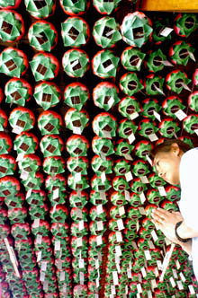 26日の釈迦誕生日を前にして、各寺刹では燃燈をともして釈迦の誕生日を祝っている。韓国では毎年、様々な燃燈を寺をはじめ町中につるし、明るく照らす。「説一切有部経典」によると、釈迦の時代の「阿世王」が祇園精舎で釈迦に法門を教わった際、佛弟子たちが油燈をともして法会の場を照らしたことが由来だという。燃燈をともして釈迦に恩返しをすると同時に自らの知恵を照らすという意味である。21日、大邱市壽城区の法旺寺の法堂で、信者が燃燈の下で熱心に合掌している。