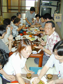 この日、昼食の食膳には各種のキムチのほか、お祝いの九節飯や薬飯などが並んだ。お年寄りたちは「昼間、家でテレビみていても笑うこともないしあかん。こんな場所がほしかった」「ウリマルで話せて、ウリ・パンチャンが食べられるのがいちばん」と「のりばん」の開所を喜んでいた。