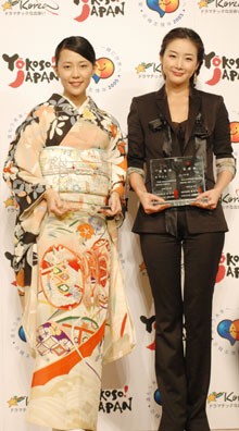 韓日観光交流拡大セレモニーが22日都内で開かれ、ドラマ「冬のソナタ」で人気のチェ・ジウさん(29)が女優の木村佳乃さん(28)とともに「韓日共同訪問年広報大使」に任命された。