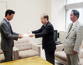 [ 都知事あての要望書を手渡す朱副団長(中) ]
