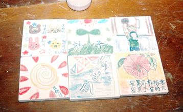 民団中央本部主催の2004オリニ・ソウルジャンボリーに参加したオリニ約300人全員が8月10日、タイル画づくりにチャレンジ、個性豊かに完成させた。タイル画はタテ・ヨコそれぞれ10㌢サイズ。復元される清渓川のほとりに設置する予定の「参与と和合の壁」にはめ込まれる。祖国での記念を半永久的に残すことになるだけに、当のオリニたちはもちろん、わが子と韓国との絆を育てたいと願って参加した保護者たちも、民団の計らいを手放しで喜んでいた。