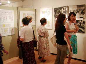 [ パネル化された当時の新聞報道と写真に見入る人たち ]