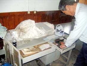 [ 泥まみれになったスチールデスクの中を点検する金東天支団長 ]