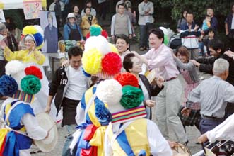 [ 農楽隊の演奏に興じて踊り出す同胞ら(埼玉) ]