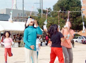 「スプーンレース」では、ピンポン・ボールを指で止めて走ったり、ポロポロ落としては拾う姿に「がんばれー!」と声援が送られた。婦人会同本部のオモニたちが焼いたチヂミは毎年好評で、朝から注文が殺到した。