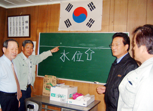 [ 台風で濁流に呑み込まれた播丹支部で水位の説明を受ける金宰淑団長ら(10月31日、兵庫) ]