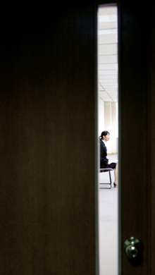30人の募集に1900余人の志願者が集まり、60対1を超える競争率となった三星・エバーランドの面接試験場の光景。わずかに開いた扉の間に緊張している新卒者の姿が見える。不況が続くなか、青年失業人口の増加が社会問題となっている韓国でも、就職活動の時期を迎え、新入社員の面接試験が行われている。新卒者の就職は「ラクダが針の穴を通るより難しい」というが、企業の立場も同じである。多くの求職者のなかから玉石を選別するのが簡単ではないからだ。このため新入社員面接時には各企業ごとに、独特な選抜方式が導入されている。