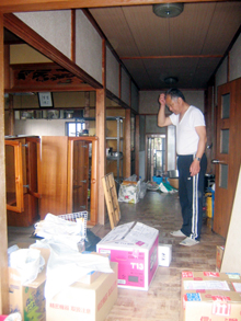 梶原地区で高周波加工を営む金実さんの居宅と工場は道路から40㌢も高いところに建っているにもかかわらず、天井近くまで川水に浸かった。家財の泥は洗い流したものの、まだ乾ききるまでには至っていない。