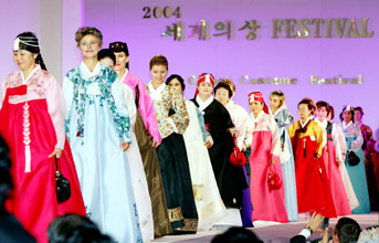ソウル南大門路のヒルトン・ホテルで開かれた「04世界衣装フェスティバル」で、46カ国の駐韓外国大使夫人が韓服ファッションショーに参加、洗練された姿を披露している。身長や皮膚の色が違ってもやはり韓服の華麗な色はみなよく似合う。