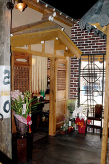 韓国の街並みを再現した店内には、ハングルの書かれた電柱や看板を多数配置。朝鮮朝の箪笥や机などの家具と焼きもの、人形といった調度品や内装の8割は韓国からの輸入品。店名には朝鮮朝の雰囲気を大事にしたことと、午後5時〜午前2時30分の夜間営業の意味を込めた。