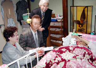 [ 脳溢血で寝たきりの金寅吉さんを激励する ]