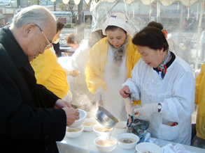 冷え切った身体を温めて好評だったのが、式典開始30分前から無料で振舞われた婦人会兵庫本部のトック。これは10年前の炊き出しを再現したものだ。ステージがしつらえられた広場を囲んだ屋台は、民団関係のほかに金剛学園PTAと教職員によるトッポギやホルモン焼き、近畿産業信組の焼きそば、さらにはベトナム、ペルー、ギリシャ、ブラジル、インド、モンゴル、タイなどのお国自慢がズラリ。