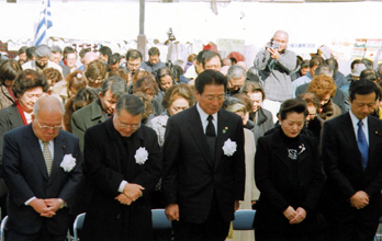 [ 犠牲者に黙とうを捧げる(左から)原亮介兵庫県議会議長、羅鍾一駐日韓国大使、金宰淑民団中央団長、金定子婦人会中央会長、白眞勲参議院議員 ]