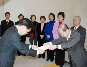 [ 都(左)に要望書を手渡す朱副団長