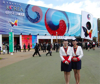 そのゲートから左手に数分歩いたところが、アジアゾーンのグローバル・コモン1で、一番奥が韓国館。正面の壁には国旗をデザイン化した太極マークと、5色の蝶の凧が大きく描かれ、遠くからでも目立つ。太極文様の5色の蝶は希望や幸福のシンボルで、韓民族の無限の叡智と発展を象徴する。