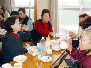 ハルモニたちの年齢は70代が中心。「毎週楽しみにしている」という姜今順さん(71)は、待ちきれないとばかり、世話役の婦人会役員と一緒になって手伝う。最高齢の金徳南さん(82)は病院への行きしな、分団に立ち寄るのが毎土曜日の日課となっている。高正子さん(74)は「同胞どうしいろんな話ができてストレス発散になる」と明るく笑った。