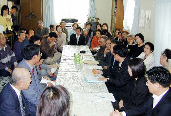 [ かつての飯場跡、集会場で住民から窮状を聞く国会議員団(右) ]