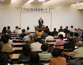 【島根】島根県議会による「竹島の日」条例制定や歴史教科書問題をめぐり悪化した韓日関係の修復を願い、民団島根県本部(洪淳永団長)は7日、松江市殿町の県民会館で韓日歴史認識講座を開催した。島根県内の在日韓国人と日本人との相互理解と交流を狙いとした企画で、会場は140人でほぼ満員となった。 同本部は「開かれた民団を目指そう」と昨年10月、民団会館で韓日市民交流の集いを開いた。この試みが好評だったことから、「韓日友情年」にちなみ今年1月から県内での家庭料理講座や韓国での市民交流などを計画していた。ところが、県と姉妹提携を結んでいる慶尚北道が3月10日の条例制定に反発して断交したことから、民団側としても「友好には互いの歴史を知る必要がある」として急きょ歴史講座へと切り替えた。