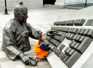 仁川市・東春洞のガス科学館広場に設置されている彫刻像「蒋英實の夢」前で子どもがキーボードに触っている。蒋英實は朝鮮朝時代の最高の科学者だ。低い身分に生まれたが、科学的才能を世宗大王に認められ、1434年、世界最初の測雨器を発明したのをはじめ太陽時計、水時計、各種天体観測器具など、数多くの発明品を残した。