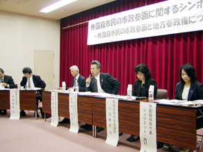 [ シンポで地方参政権付与の必要性を語る薜団長(中央) ]