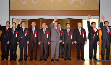 [ 前夜祭であいさつする金元基国会議長(中央)ら韓国代表団=10日、名古屋市内のホテル ]