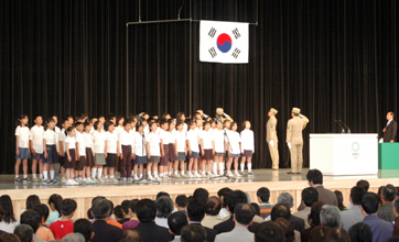 [ 韓国の国旗掲揚に合わせて、韓国語で愛国歌を斉唱する地元の小学生 ]