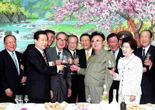 [ 共同宣言に署名後、杯を交わす南北首脳ら=2000年6月15日、平壌 ]