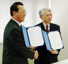 [ 協定書を交わす長崎県教委の立石教育長(右)と陸総長 ]