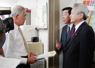 取材陣が殺到して身動きが取れないほど緊迫するなか、出張中という小沼教育長に代わって応対した平山正彦教育次長に、林団長らは「誤った歴史認識に貫かれた教科書で学べば、韓日の子どもたちにアツレキや偏見が生まれ、友好関係にひびが入る。どう責任をとるのか」と詰め寄った。平山次長は「答える立場にない。教育長との強い面会要望を伝える」と回答するにとどまった。林団長は「教育長に会うまで粘り強く対処する」と釘を刺し、「つくる会」教科書の採択撤回を求める要望書を手渡した。