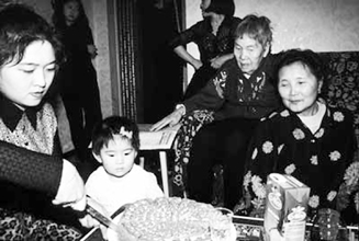 [ 孫娘の誕生日を祝うハルモニ。でも、「祖国で死ねたら」と願う=ユジノサハリンスクで02年2月、片山通夫さん撮影 ]