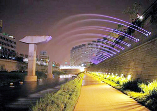 清溪川はかつて、ソウル中心部を西から東に流れ、中浪川を経て漢江に合流した。わずか11㌔の川は市民の川として親しまれてきたが、50年代後半、近代化のシンボルとして埋め立てられ、高架道路に変わった。ところが、02年にソウル市長選に立候補した李明博氏は、経済発展一辺倒の姿勢を反省し潤いのある街作りとして清溪川の復元を公約にかかげ、当選後、行動を起こした。