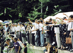 [ 犠牲者を悼み海に献花する参加者 ]