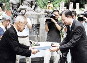 【京都】日本の敗戦直後、舞鶴湾で謎の爆沈を遂げた旧海軍輸送船「浮島丸」に乗船していた韓国人犠牲者を悼む第60周年集会が24日、舞鶴湾下佐波賀の浮島丸殉難の碑公園前で400人出席のもと、しめやかに行われた。市民団体「追悼する会」が主催、今年初めて韓国から遺族2人が参加した。