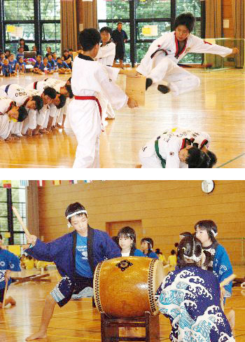 [ 東京韓学児童によるテコンドー演武(上)と日本人児童の和太鼓演奏