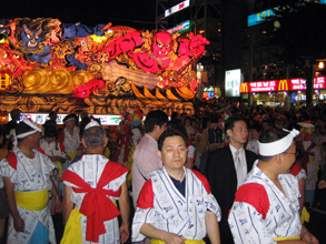 夜のパレード公演で最後尾を飾ったのは青森のねぶた。日本の自治体としては最多の370人が参加し、威勢のいい掛け声とともに幅11㍍、高さ5㍍の大型ねぶたを引っ張った。夜の街に映える壮大な光景に沿道をびっしり埋めたソウル市民から大きな拍手と声援が送られた。