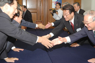 [ 公明党首脳陣と握手する金宰淑中央団長(右側中央)と辛容祥常任顧問(同手前)ら=3日、国会内 ]