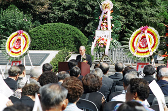 大阪から毎年参席しているという在日2世の女性5人は口々に「祖国を守らなければならないと言い残し、戦場に散った夫の死をとても誇らしく思う。式典に出席するたびに感慨を新たにする」と思いを込めた。