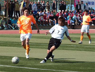 5分過ぎからペースをつかんだ在日は10分に早いパス回しから元昌勝が先制ゴール。これで波に乗り、18分、ペナルティエリア左前で得たFKを梁秀誠が直接ゴールし加点。さらに20分すぎ、DF厳士鎔が早いパス回しからドリブルで持ち込み3点目を決めた。