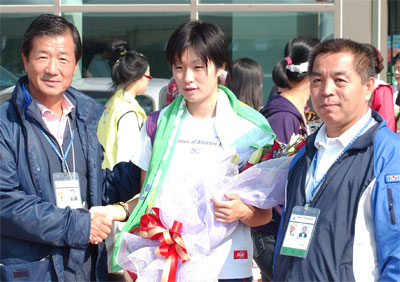 [ 2種目で4位入賞を果たした劉紅美(中央)。金昭夫団長(左)と韓龍化総監督が健闘のねぎらい ]
