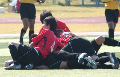 [ 決勝進出を決め抱き合って喜ぶ在日同胞イレブン ]