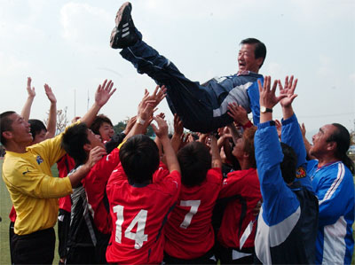 [ 劇的な結末で優勝。イレブンらに胴上げされる金昭夫選手団長 ]
