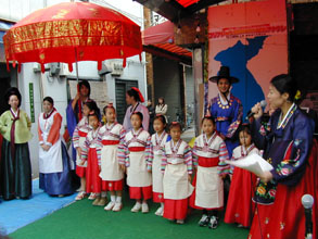 王と王妃のモデルは今年度の実行委員会会長でもある洪呂杓さん夫妻(班家食工房経営)が務めた。夫妻の後をチャングムの衣装に身を包んだオリニたちと宮中の女官に扮した保護者、白頭学院建国学校の児童によるサムルノリ隊が続いた。