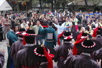 好天下の沿道は、農楽隊のリズムに踊り出す人やにわかカメラマンなどでごった返した。正使、副使、従事官など4種類、20着の衣装は韓国一流の伝統衣装家が復元したものだけに、多くの女性がテレビ・ドラマの「テジャングム(大長今)と同じだ」と歓声を上げた。副使役で登場した景民杓・民団埼玉本部副団長は、服装について質問攻めに合っていた。