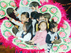 メンバーが五面太鼓や扇の舞、サムルノリを披露すると、オリニは「すごーい」「うわー、きれい」といった歓声を上げた。なかでも扇の舞には心を奪われ、オリニたちも挑戦。メンバーの指導で見事な花模様をつくって大きな拍手を浴びた。婦人会兵庫県本部の金彩玉会長も感心した様子。