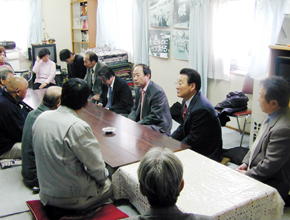 [ 京都府宇治市ウトロ地区の市民と対応策を話し合う金宰淑・中央団長(右から2人目)と金有作・京都団長(その左隣)=9日 ]