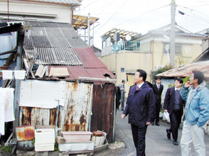 【京都】00年に土地所有権訴訟で全面敗訴し、65世帯200人の同胞が日夜、強制執行の不安におののく宇治市伊勢田町ウトロ地区を9日、民団中央本部の金宰淑団長が初めて視察した。民団京都府本部の金有作団長や地元南京都支部の李基安支団長らが同行した。