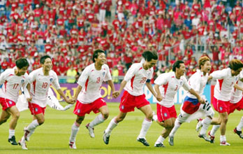 [ 前大会でベスト4進出を決め、喜ぶ韓国イレブン ]